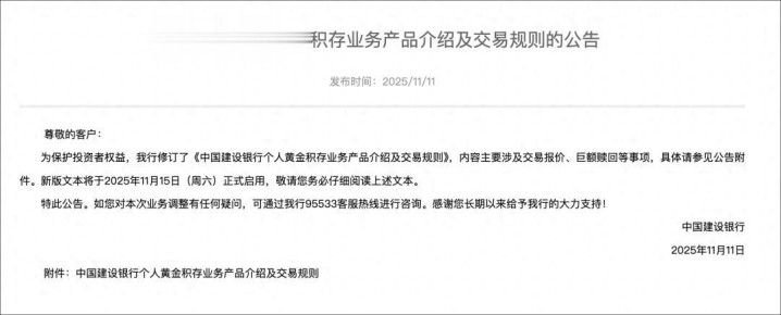 11月11日,建设银行公告称,为保护投资者权益,修订了《中国建设银行个人黄金积存业务产品介绍及交易规则》,内容主要涉及交易报价、巨额赎回等事项。新版文本将于2025年11月15日(周六)正式启用。