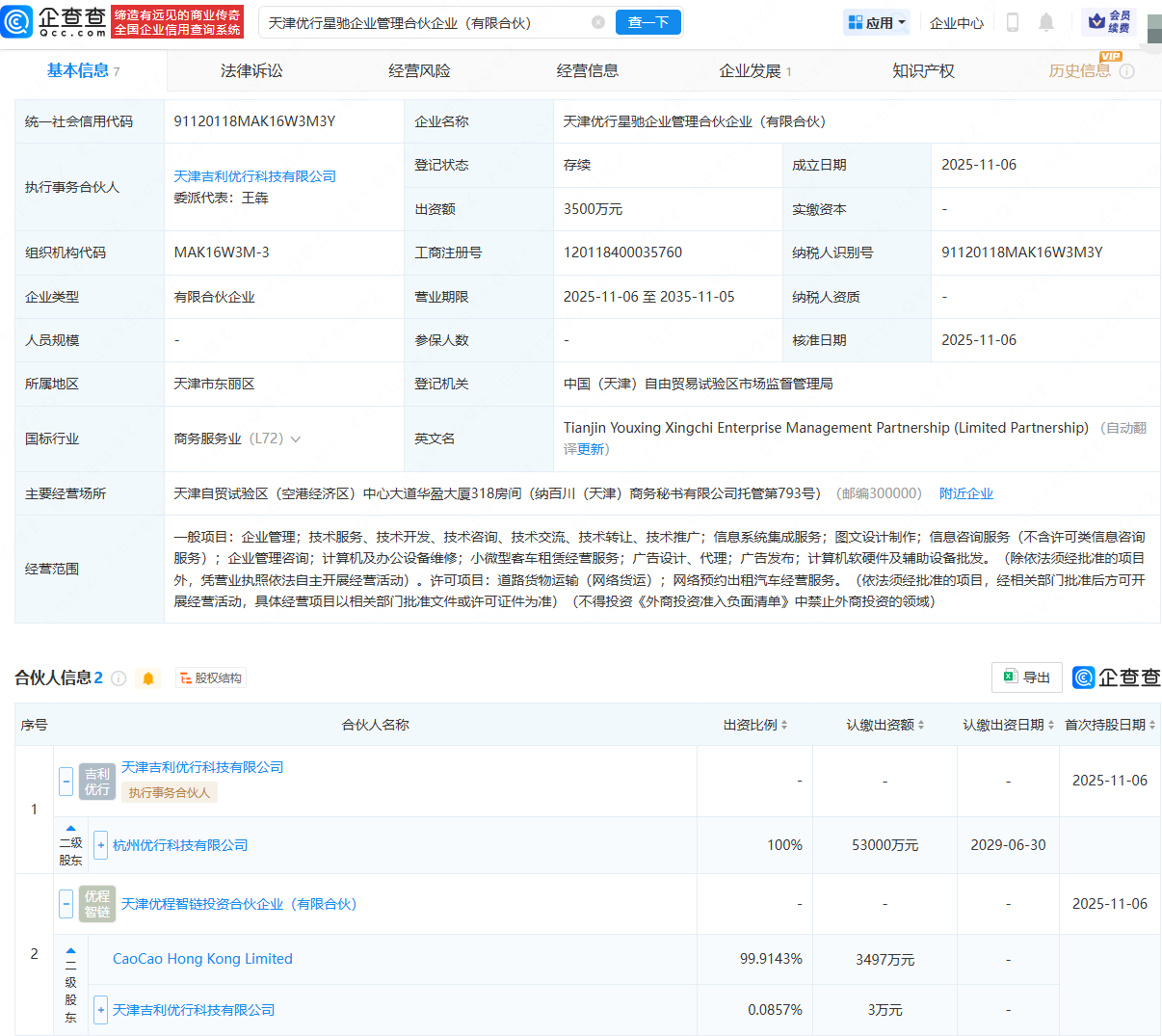 近日,天津优行星驰企业管理合伙企业(有限合伙)成立,出资额3500万元,经营范围包含:企业管理、信息系统集成服务、小微型客车租赁经营服务等。企查查股权穿透显示,该合伙企业由曹操出行旗下天津吉利优行科技有限公司、天津优程智链投资合伙企业(有限合伙)共同出资。